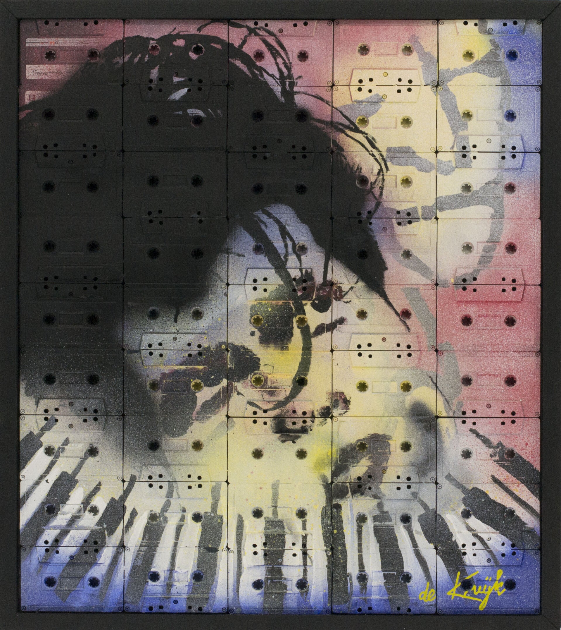 This mixed media painting is made from cassette tapes, on which multiple layers of acrylic have been applied using spray paint, brush and markers.